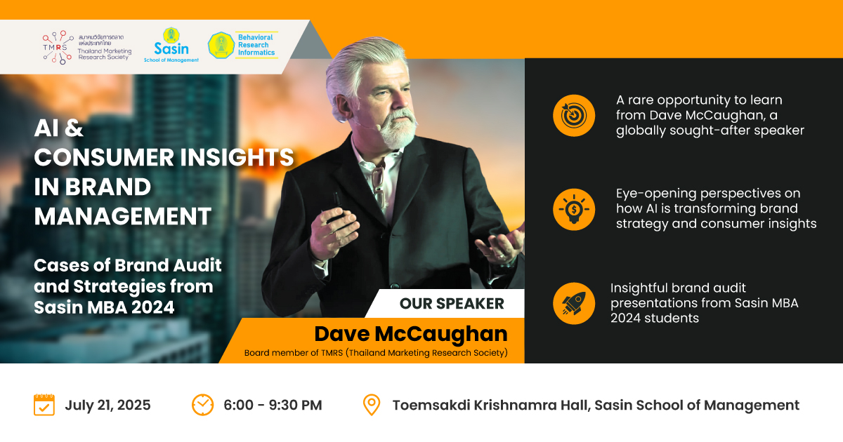Join us for an evening of learning and exchange at AI & Consumer Insights in Brand Management, featuring real-world insights from industry and academia. This special session, part of Sasin’s Brand Management course led by Assistant Professor Yupin Patarapongsant, will spotlight the intersection of artificial intelligence and brand strategy. Our featured guest speaker is Dave McCaughan, a highly respected voice in consumer insight and storytelling, who will lead a session on “AI and Insights.” The event will also showcase brand audit project presentations by Sasin MBA 2024 students, offering fresh perspectives on contemporary brand challenges. Date: July 21, 2025 Time: 18:00 – 21:30 Venue: TK Hall, Sasin School of Management REGISTER HERE *This event is open to the Sasin community, alumni, and marketing and insight professionals affiliated with the Thailand Market Research Society — including those from advertising agencies, corporations, and the broader insights industry. What to Expect:- A rare opportunity to learn directly from Dave McCaughan, a globally sought-after speaker