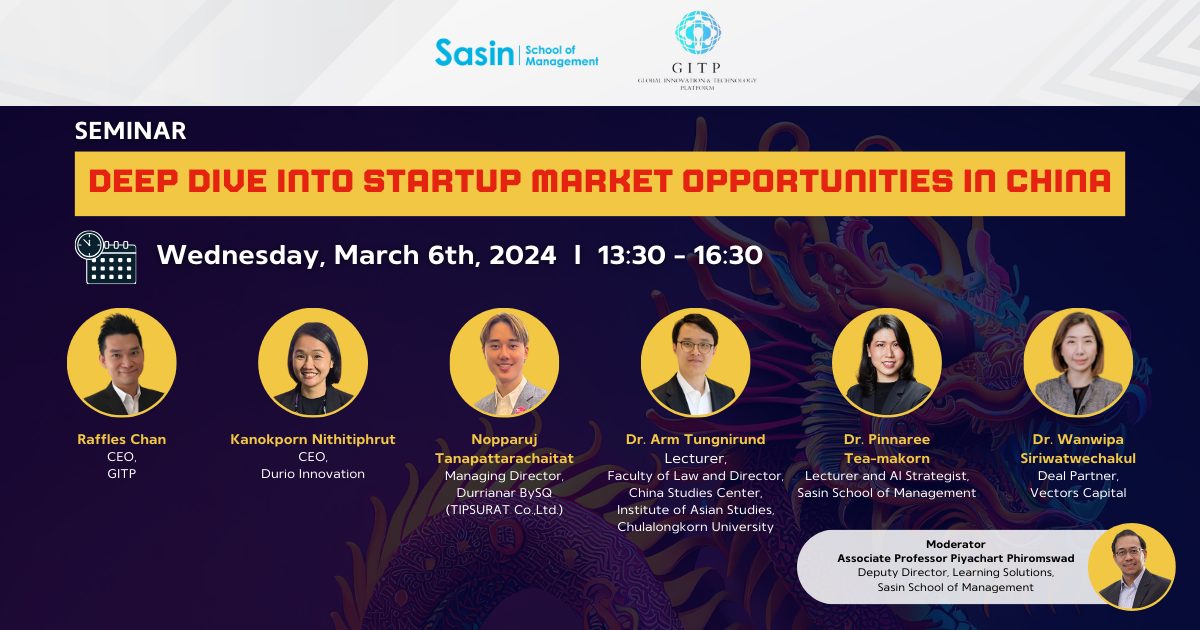 Discover the immense possibilities that await entrepreneurs in China’s dynamic market! Sasin School of Management and Global Innovation & Technology Platform (GITP) cordially invite you to an enlightening seminar, “Deep Dive into Startup Market Opportunities in China.”