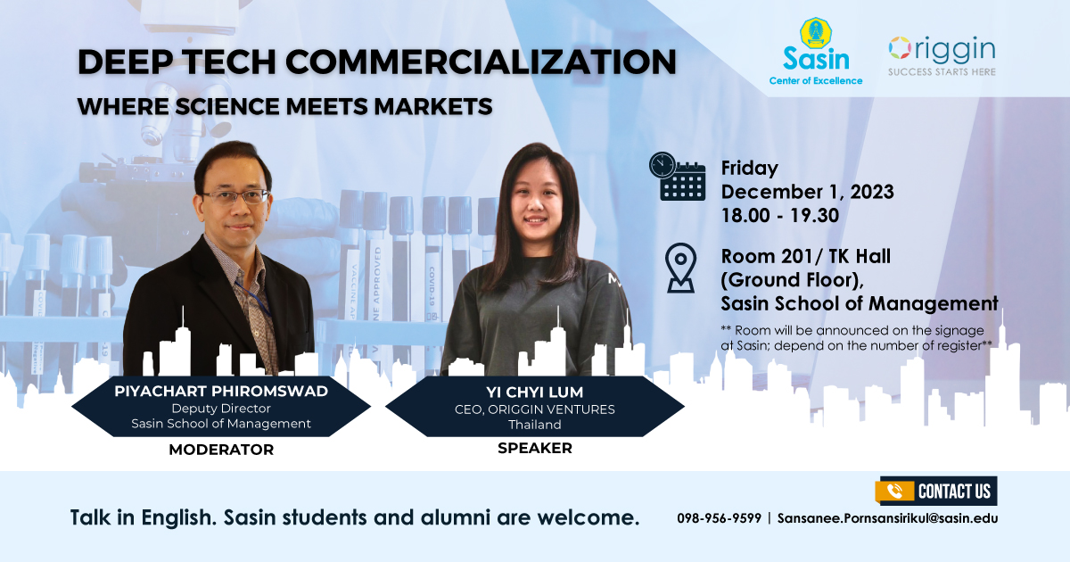 Join us for an insightful exploration at the intersection of innovation and business – ‘Deep Tech Commercialization: Where Science Meets Markets.’ Featuring discussions led by Associate Professor Piyachart Phiromswad, Deputy Director at Sasin School of Management, and Yi Chyi Lum, CEO of ORIGGIN ventures, Thailand.