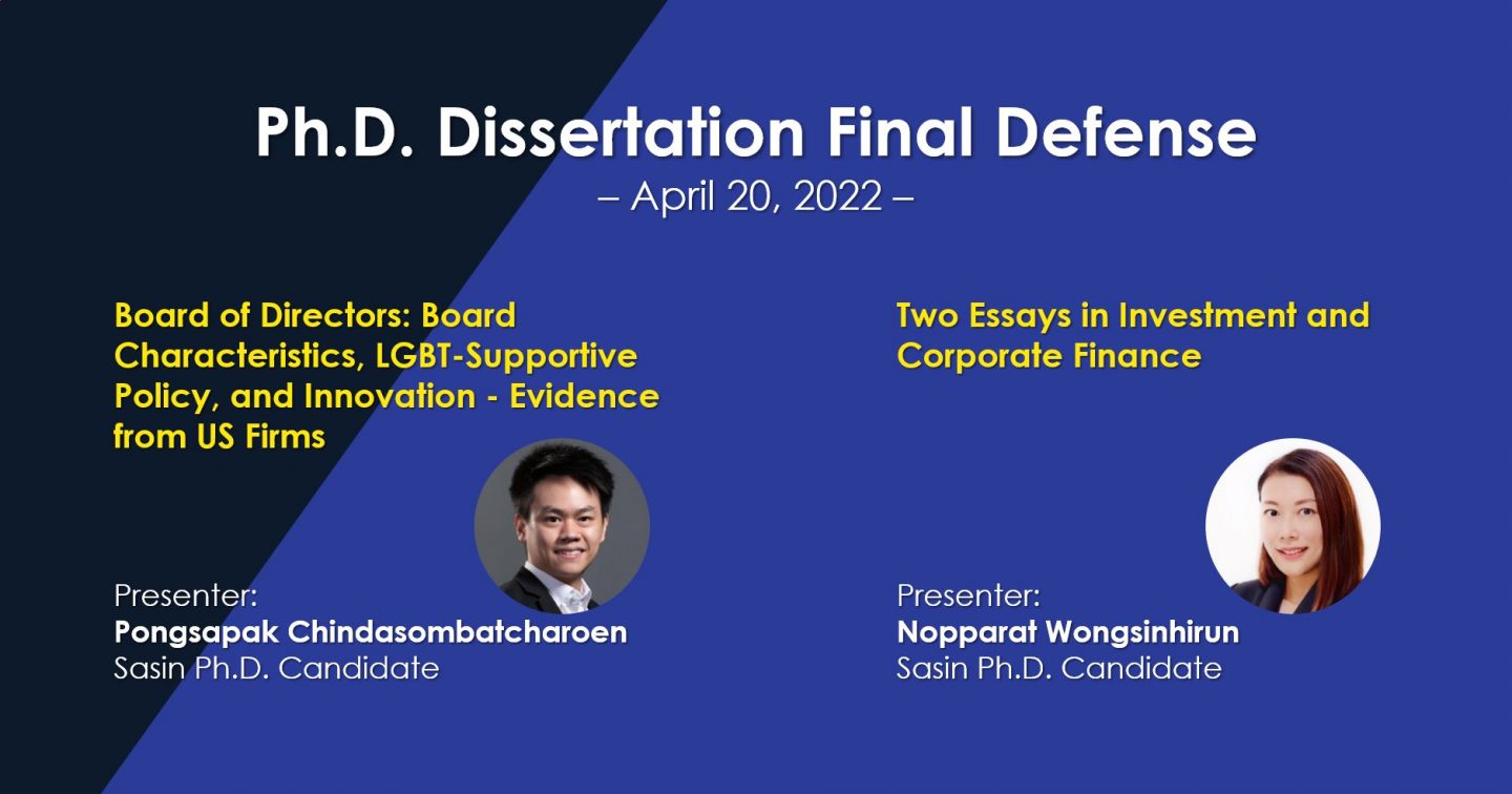 Sasin Ph.D. candidates will have their Ph.D. Dissertation Final Defense on April 20, 2022 at Sasin School of Management and the event is open to the public.