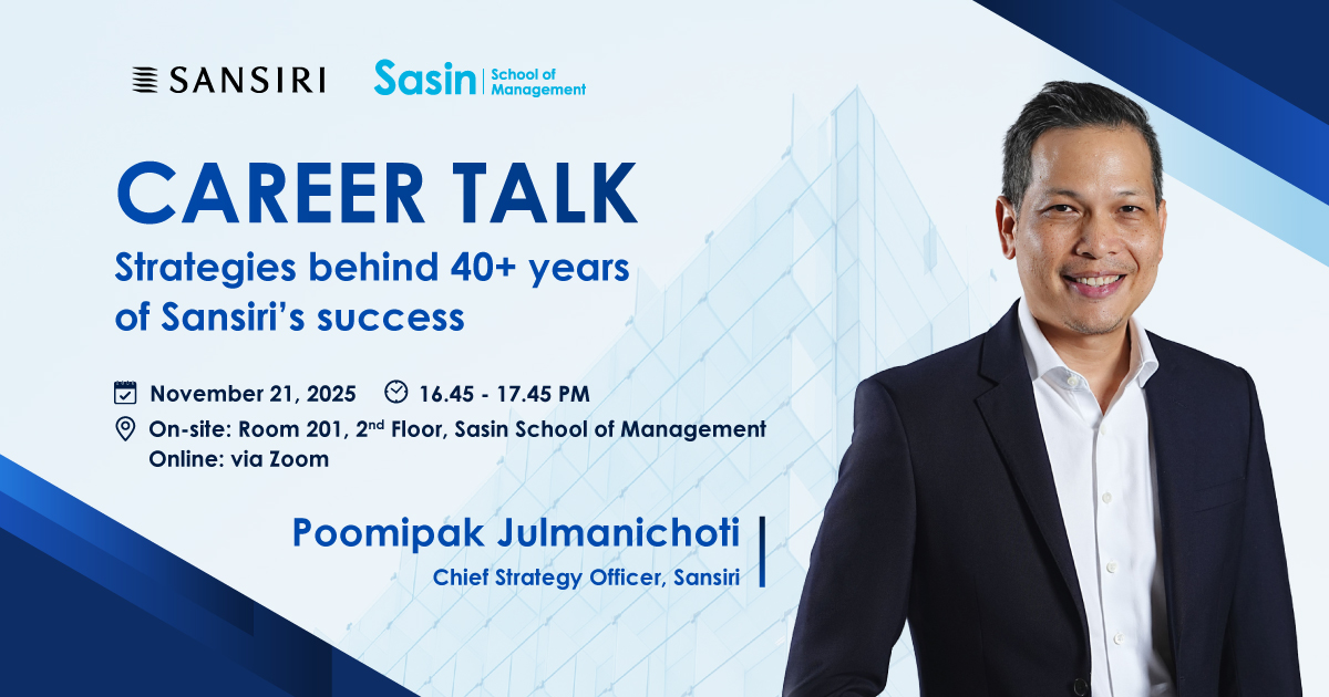 Sasin is pleased to welcome Poomipak Julmanichoti, Chief Strategy Officer of Sansiri PLC, who will share his insights on: