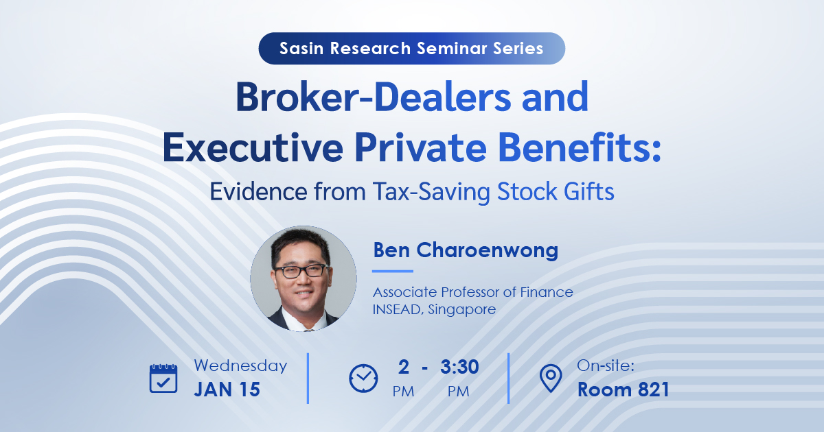 By Ben Charoenwong Associate Professor of Finance at INSEAD, Singapore Wednesday, January 15, 2025, 2 pm – 3.30 pm Venue: Room 821 at Sasin School of Management Register here to reserve your seat Abstract: This study provides a new perspective on the intersection of financial intermediary oversight and managerial self-dealing. In the early 2010s, regulatory changes increased oversight of BD internal controls, introducing stricter external scrutiny of their systems and procedures for handling client transactions. We document a significant decline in the backdating of insider stock gifts-a practice used by executives to inflate the value of charitable donations and garner large tax benefits-particularly for transactions processed through BDs previously exempt from oversight. This finding highlights the critical role of intermediaries in curbing financial misconduct and offers broader insights for regulatory design aimed at enhancing external governance mechanisms. For more information please contact +66-2218-4000 ext. 83893 or [email protected].Share this article
