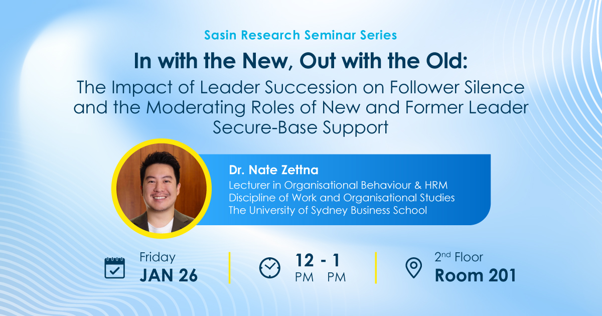 By Dr. Nate Zettna Lecturer in Organisational Behaviour & HRM, Discipline of Work and Organisational Studies, The University of Sydney Business School Friday January 26, 2024, 12:00 pm -1:00 pm Venue: Room 201, Sasin School of Management. Please register here to reserve your seat. Abstract: Research on employee silence – the withholding of thoughts, suggestions, and ideas about important work issues – remains embryonic regarding its dynamics during times of structural organizational change, such as when there are changes in leadership (i.e., leader succession). We apply followership theory to examine the notion that leader succession can serve as a relatively instant stimulus to break the enduring cycle of followers’ silence towards the leader. We also investigate how changes in leader secure-base support (support that provides a secure and safe base for followers to explore new changes and opportunities) from new and former leaders can make a key difference in shaping follower silence during leader succession. We conducted a quasi-experimental field study with a total of 107 bank branches across four time points capturing periods before and after a leadership change, with approximately half of the branches experiencing leader succession. We found that leader succession prompted a reduction in follower silence, such that followers were less likely to withhold important ideas/thoughts/information towards their new leader than their former leader. This effect was strongest when the new leader showed higher leader secure-base support and the former leader exhibited lower leader secure-base support. Our insights extend knowledge on the effects of leader succession on silence behaviors and the important role of new and former leaders’ secure-base support in reshaping silence dynamics. For more information please contact Khun Nanthapak Pinyo at 091 479 4551, 02 218 4036 or [email protected].Share this article