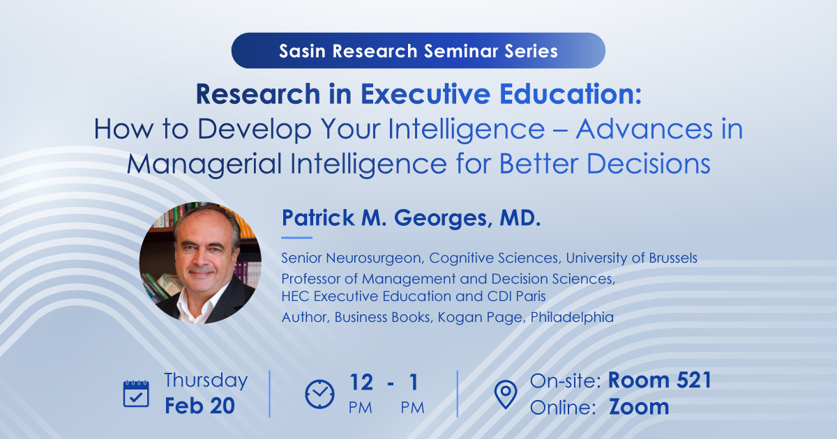 By Patrick M. Georges, MD. Senior Neurosurgeon, Cognitive Sciences, University of Brussels Professor of Management and Decision Sciences, HEC Executive Education and CDI Paris Author, Business Books, Kogan Page, Philadelphia Thursday, February 20, 2025, 12:00 PM – 1:00 PM Venue: Room 521 at Sasin School of Management or online via Zoom Register here to reserve your seat Abstract: Drawing upon the groundbreaking work of Nobel laureates in behavioral economics, Kahneman and Thaler, we have developed novel models of human intelligence that provide more accurate predictions of human decisions and behaviors. These models have found their most compelling applications in the corporate world, where managerial decisions carry particularly significant consequences. These models have enabled the establishment of principles and processes that empower decision-makers to mitigate management errors and cultivate their intellectual capabilities. This seminar elucidates these mechanisms and provides numerous examples of how managers are leveraging them to enhance their intellectual performance. From an academic perspective, research into novel models of human intelligence, particularly managerial intelligence, advances our understanding of decision-making within organizations and enhances the integration of artificial intelligence. A key finding proposes a model of human information processing consisting of six distinct cognitive systems, whose effectiveness depends on operational conditions and adherence to specific principles. The business implications of this research extend to executive education, where research-backed seminars focus on decision-making and managerial intelligence, and to management consulting through decision-support tools like Management Cockpits. Future projects include a collaboration with Google to develop a more natural interface between artificial intelligence and human intelligence, further bridging the gap between technology and human cognition. For more information please contact +66-2218-4000 ext. 83893 or [email protected].Share this article