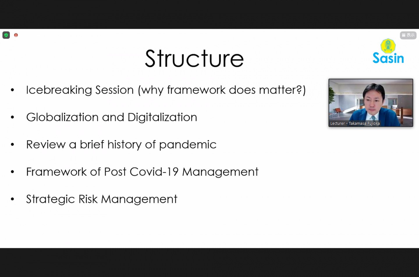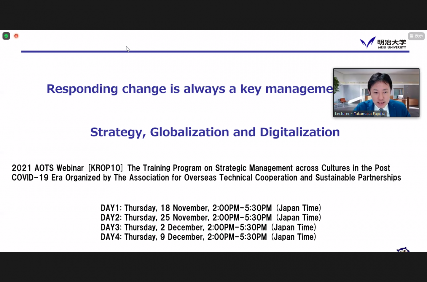 Professor Takamasa Fujioka, Director of SJC, gave a talk, “Shaping the Future through Business Transformation in the Post COVID-19 Era”, to help participants understand the framework for envisioning strategic business development in the post-COVID-19 era. Specifically, he discussed ways to develop the ability to envision the future from a global perspective by positioning the present in history and understanding the impact of digital transformation on corporate management.